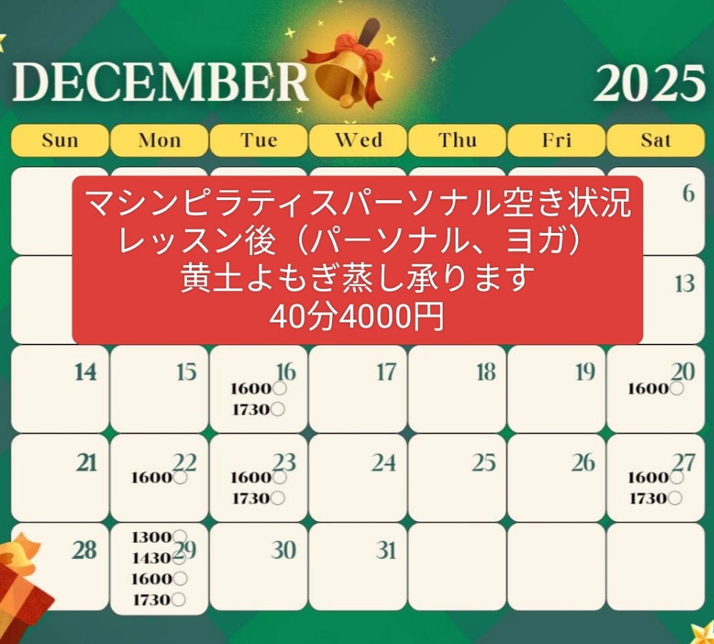 | ヨガ | 月3回 入会金3000円 月謝4000円 別途燃料費1、4、10、12月各1000円 体験のみ3000円 入会希望体験2000円 ☆月曜10時 1、2回目ヨガ、3回目ピラティス ☆月曜19時 1、2回目ヨガ、3回目骨盤ストレッチ ☆木曜10時 1回目ヨガ、2回目ピラティス、3回目骨盤ストレッチ ☆金曜19時 1、2、3回目ヨガ |