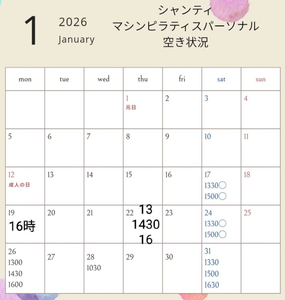 ※記載のない日にちや時間、レッスン内容相談など、お気軽にお問合せ下さい